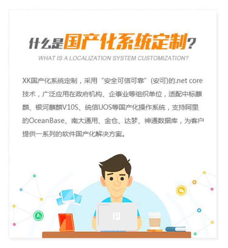 XK国产化系统定制,采用“安全可信可靠”(安可的netcore技术,广泛应用在政府机构、企事业等组织单位,适配中标麒麟、银河麒麟V10S、统信UOS等国产化操作系统,支持阿里的OceanBase、南大通用、金仓、达梦、神通数据库,为客户提供一系列的软件国产化解决方案。